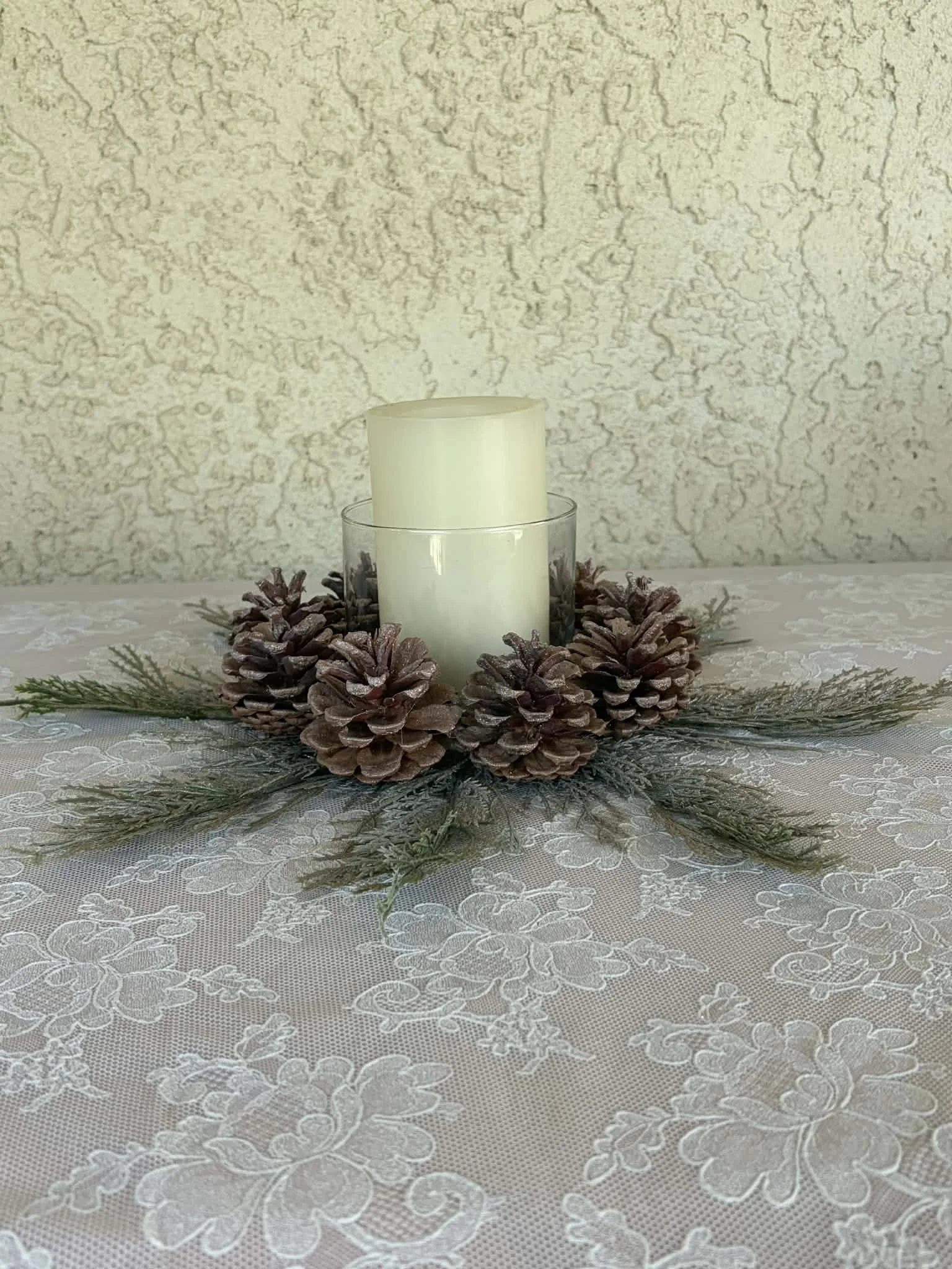 A simple wreath, add whatever you want to the center, a Vase of your choosing, a simple candle, or just leave it as is.